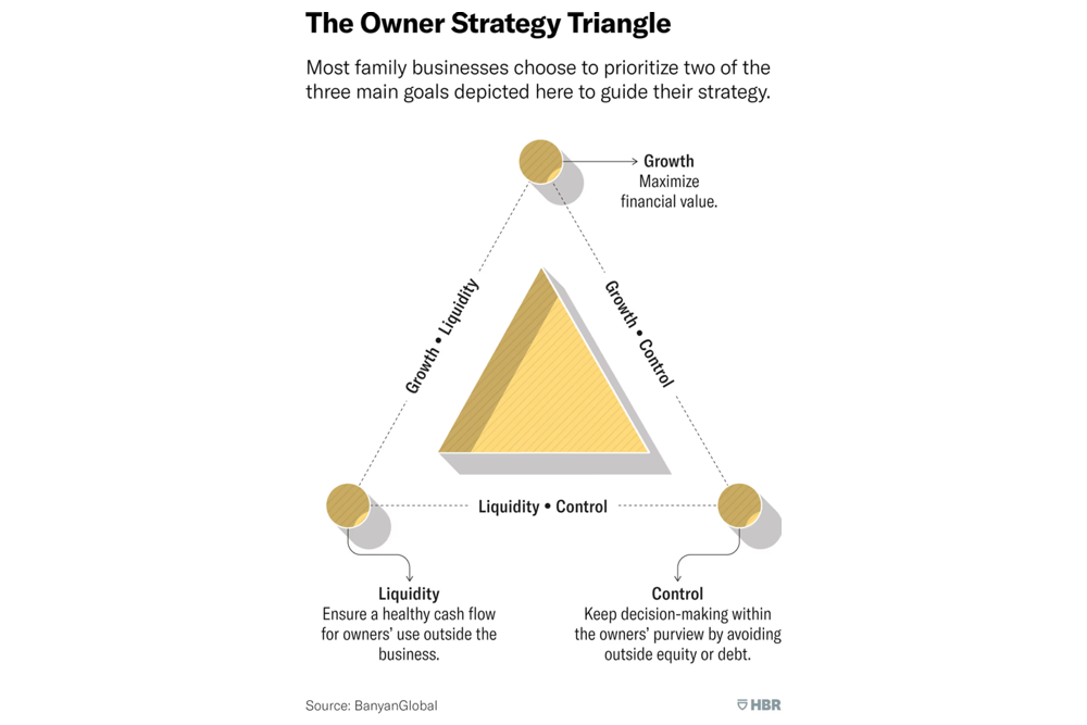 These three goals sit on points of a triangle, which Banyan Global calls the “owner strategy triangle.” Draw a triangle now and put one of these words (growth, control, liquidity) at each point. Many family business conflicts can be traced to this triangle.